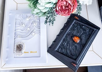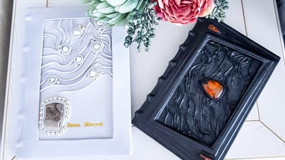 Gaminame įvairaus dydžio užrašines su logotipais ir inicialais, proginius albumus. Gali būti inkrustuoti pusbrangiais ir dekoratyviais natūraliais akmenimis arba pagaminti pagal norimą tematiką.